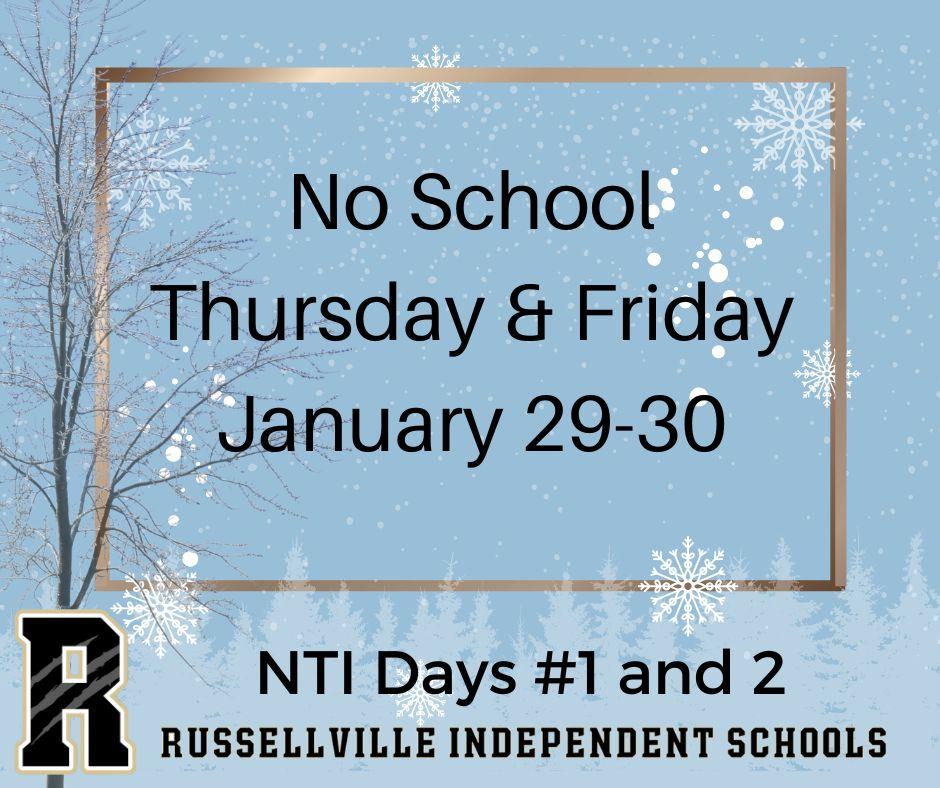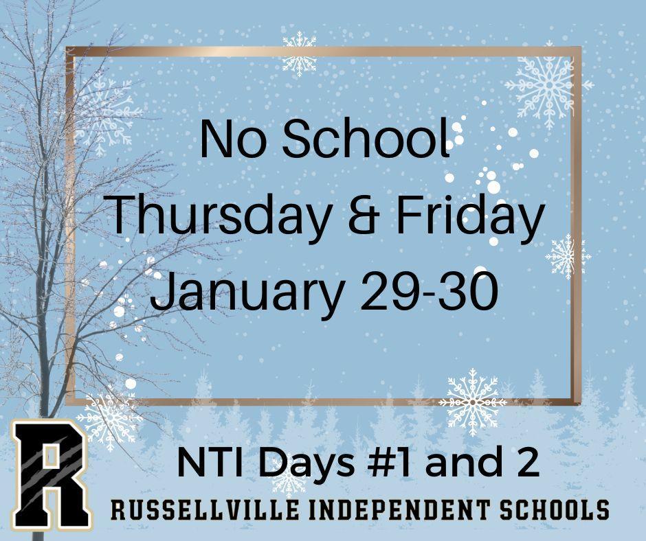 Russellville Independent School District will be closed Thursday (1/29) and Friday (1/30). These will be NTI Day # 1 & #2. Students should complete assignments and tasks provided by their teachers.